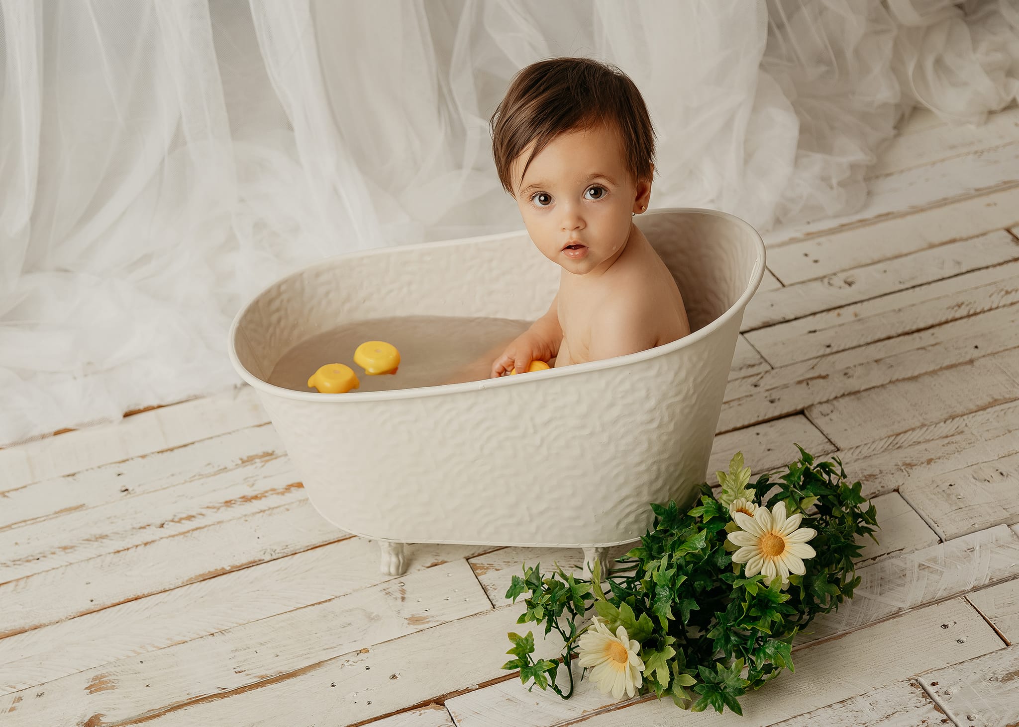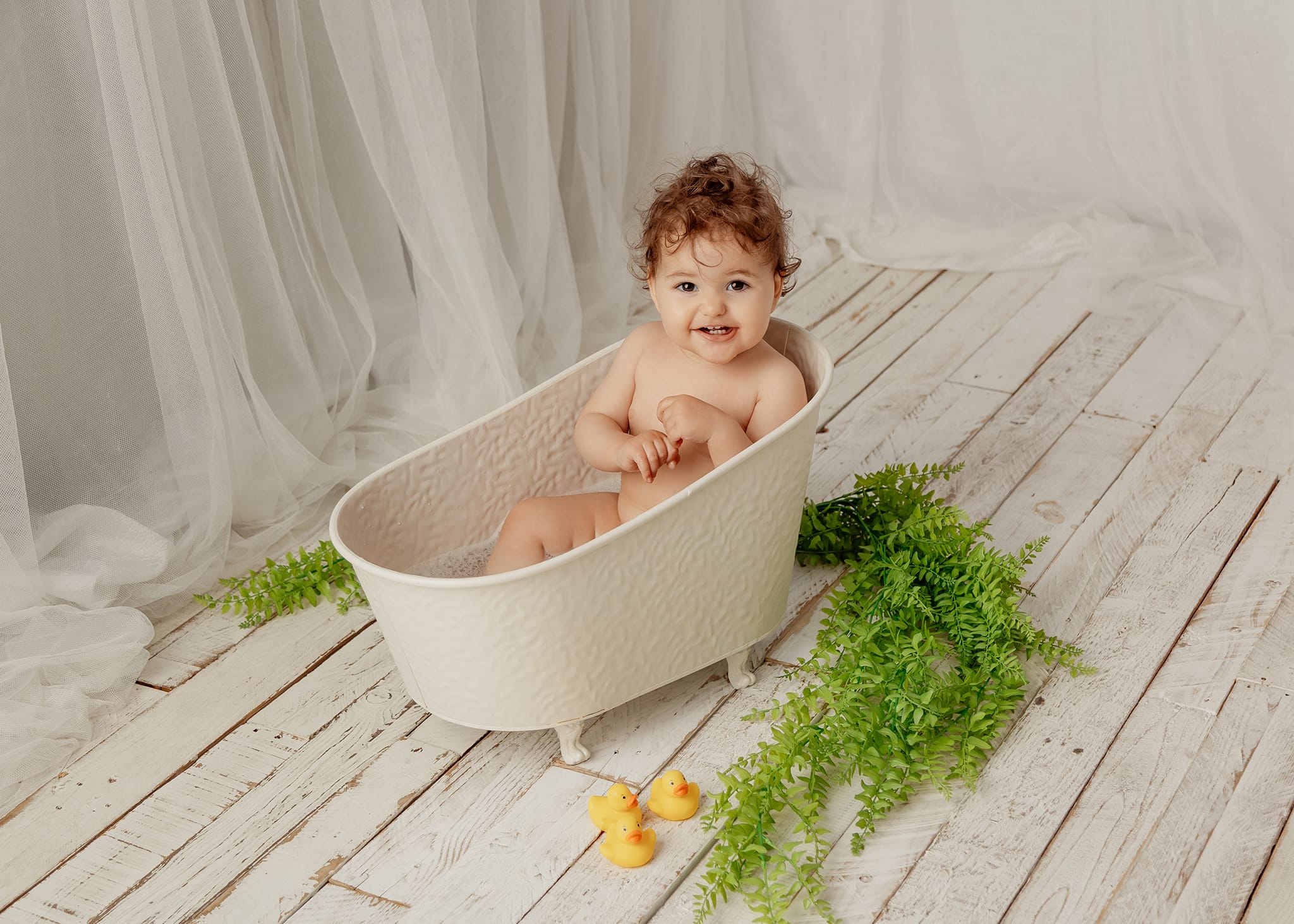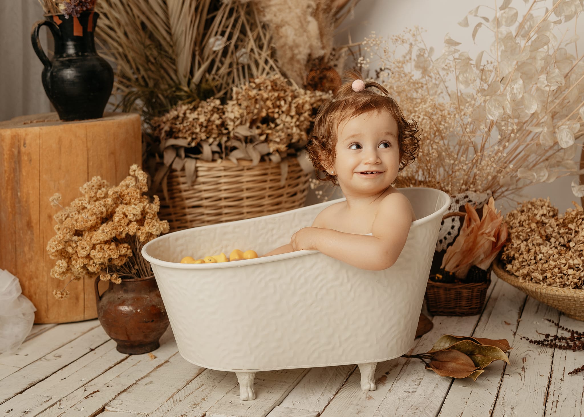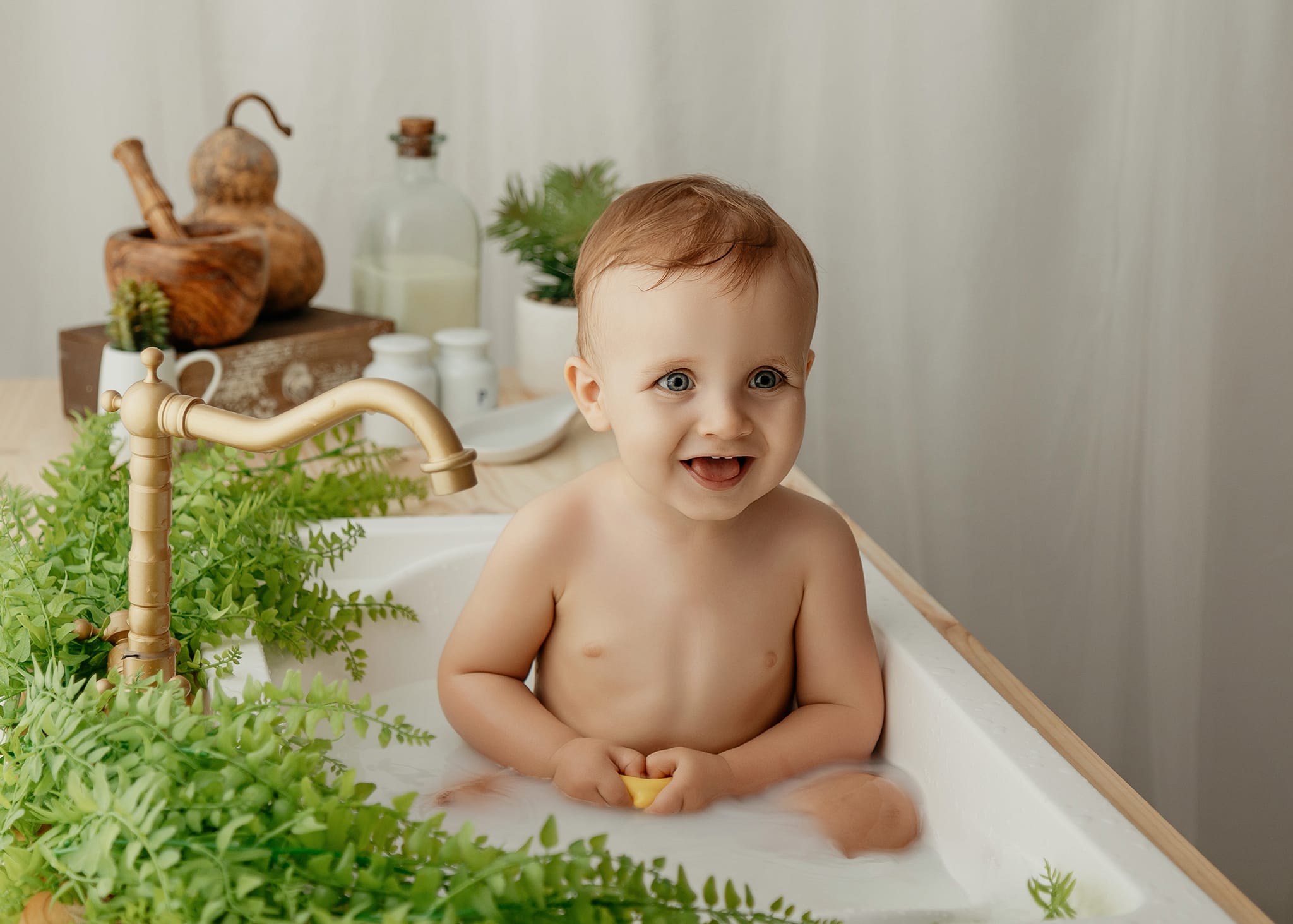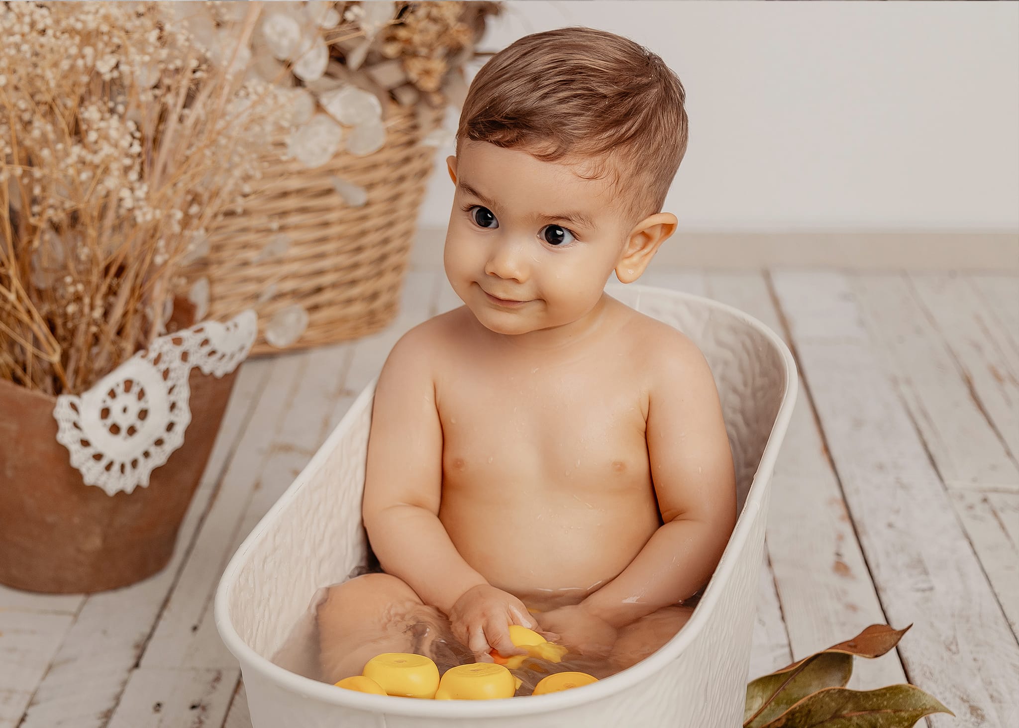 Cuando están ya bien rebozaditos y rellenitos de tarta los metemos en la bañera con agua calentita. ¡Prepárate para ver sonrisas y más sonrisas, porque les encanta!